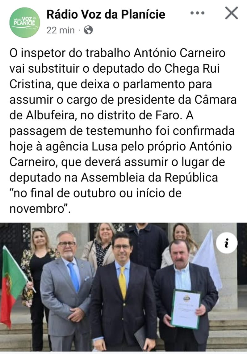 A eleição de Rui Cristina para a presidência da Câmara Municipal de Albufeira, atual deputado do Chega eleito pelo distrito de Beja, deverá levar à entrada de António Carneiro na Assembleia da República.