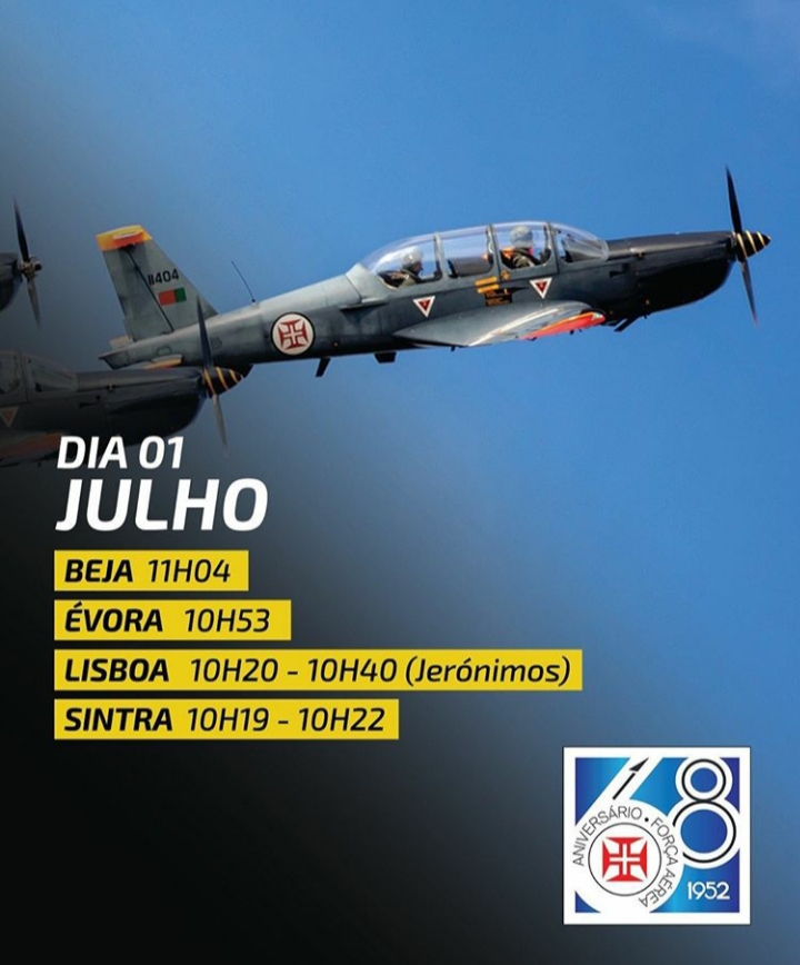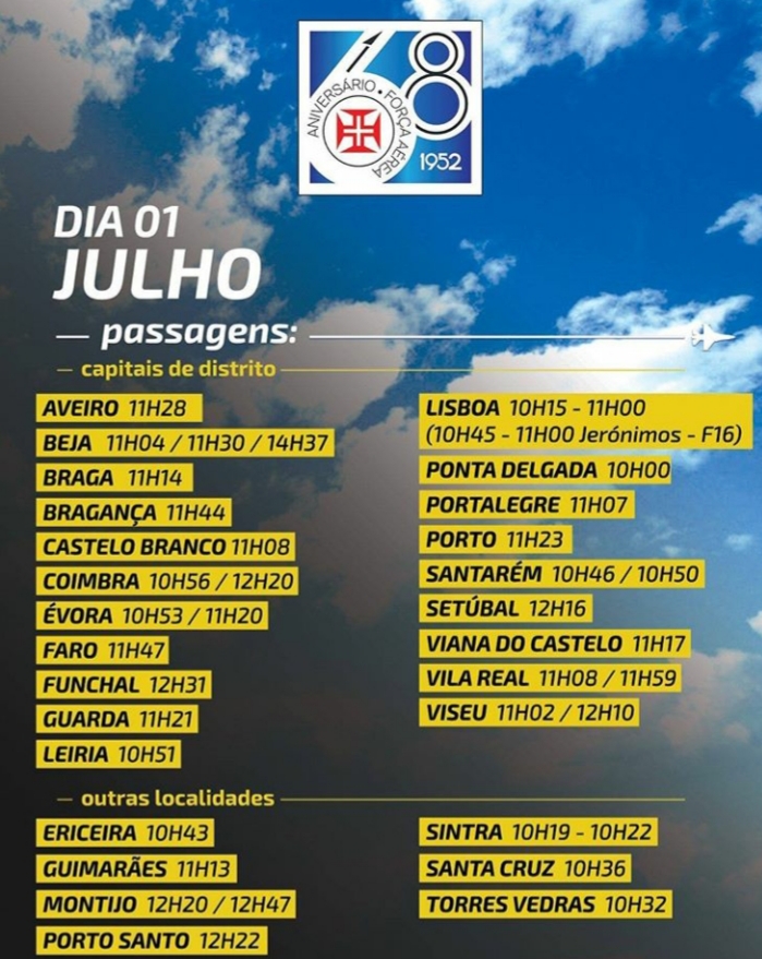 Todas as capitais de distritos serão sobrevoadas por diferentes aeronaves (Chipmunk, C-130H, C-295M, Epsilon TB-30, P-3C e F-16), entre as 10H00 e o 12H30. Os horários das passagens aéreas serão disponibilizados nos Canais da Força Aérea.