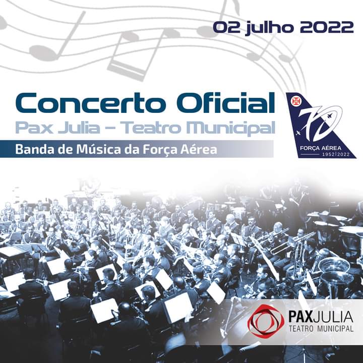 No âmbito das comemorações dos 70 anos, a Banda de Música da Força Aérea irá realizar o concerto oficial, no dia 2 de julho, próximo sábado, pelas 21h30, no Teatro Municipal Pax Julia, em Beja.