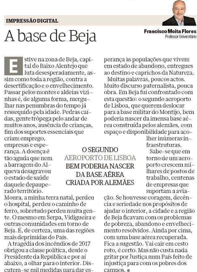 Concordo, em parte, com Moita Flores. Mas saberá ele que na Base de Beja existe um Terminal Civil, que utiliza as pistas, os serviços de controle de tráfego aéreo, assim como os serviços de assistência e socorros (vulgo bombeiros) da própria Base? Ou será que ele sabe isso e quis dizer outra coisa?