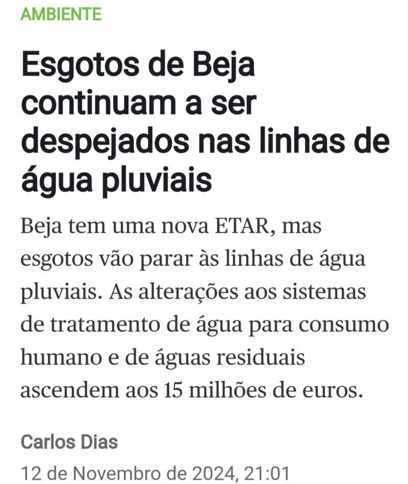 “Primeiro, sente-se o cheiro a esgoto. Depois aparecem as moscas, que obrigam os que caminham ou fazem as suas corridas a pé ou de bicicleta na ciclovia que contorna a zona urbana de Beja a fechar a boca ou a utilizar as mãos como um abanico. À medida que se avança em direcção à Rua de Lisboa, uma das principais entradas de Beja, há quem aperte as narinas para superar o odor pestilento que se intensifica com a aproximação ao local onde se encontra o incómodo: um líquido castanho fedorento corre numa das linhas de águas pluviais da bacia do Roxo. É um fenómeno recorrente que também se observa na linha de águas pluviais que corre paralela à Avenida de António Sardinha, outra das principais entradas na capital baixo-alentejana.”