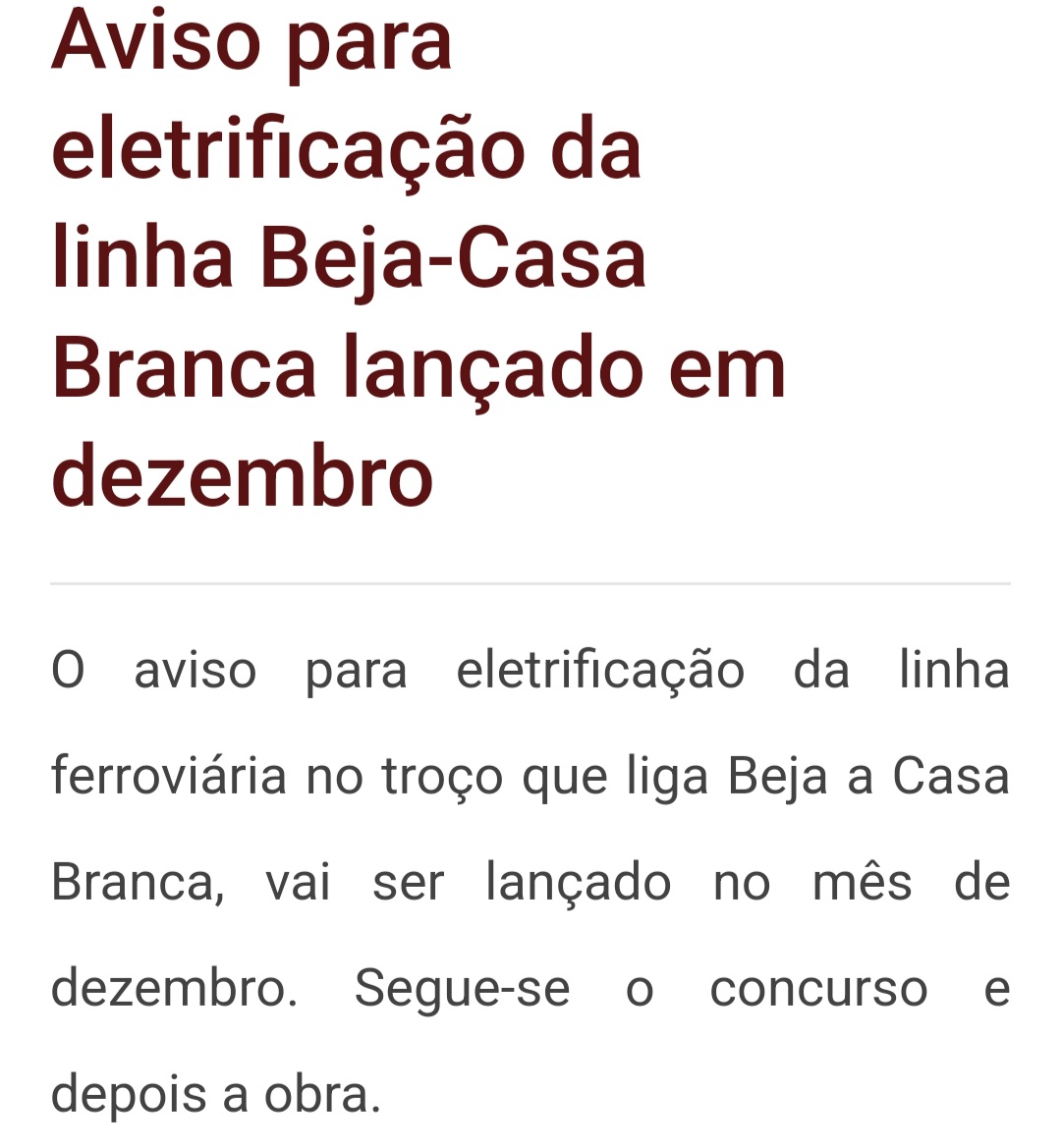 “Beja vai ficar dois anos, previsivelmente entre 2027 e 2029, sem comboios para Lisboa. A interrupção vai ocorrer durante o período em que vão decorrer as obras de eletrificação da linha ferroviária Beja-Casa Branca” in Radio Pax