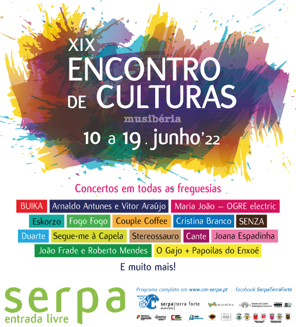 Publicado por João EspinhoDe 10 a 19 de junho realiza-se o Encontro de Culturas, promovido pelo Município de Serpa. Arnaldo Antunes e Vitor Araújo, Buika, Cristina Branco, Couple Coffee, Duarte, Eskorzo (ESP), Fogo Fogo, Joana Espadinha, Maria João, O Gajo e as Papoilas do Enxoé, João Frade (PT) e Roberto Mendes (BR), Segue-me à Capela, SENZA, Stereossauro e Batida são nomes já confirmados para esta edição. A programação integra ainda a Oficina do Brincar TUM TUM TÁ e uma oficina de dança afro-cubana, com Marta Puente, em todas as freguesias. Todas as iniciativas são de entrada livre. A programação completa, sujeita a alterações, pode ser consultada em www.cm-serpa.pt e Facebook Serpa Terra Forte.